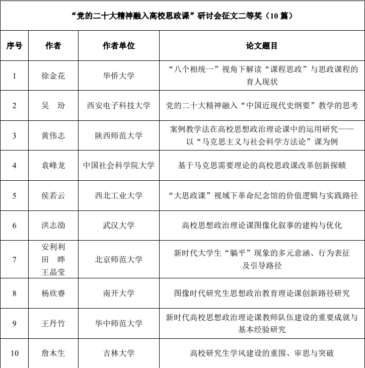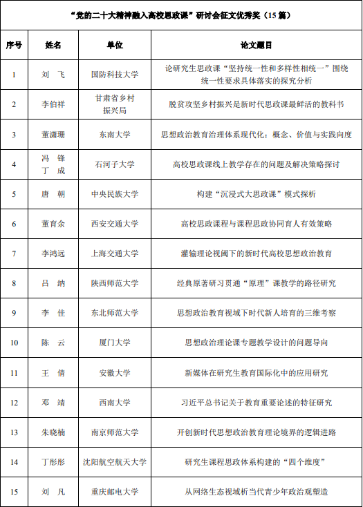 黑料网 关于“党的二十大精神融入高校思政课”研讨会自通知发布以来,得到了全国各高校师生的热烈响应,累计收到300多篇来稿,经主办方组织专家认真评审,现选出获奖论文45篇,其中一等奖5篇,二等奖10篇,三等奖15篇,优秀奖15篇。名单公布如下: