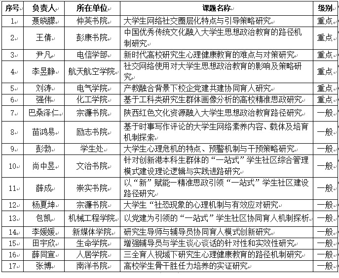 12月28日下午,学院通过组织开展2024年度辅导员专项科研项目现场答辩评审会,各专家对各项目进行了评审打分,最终共有17个项目获得拟资助,其中,重点项目6项,一般项目11项,名单见下表。