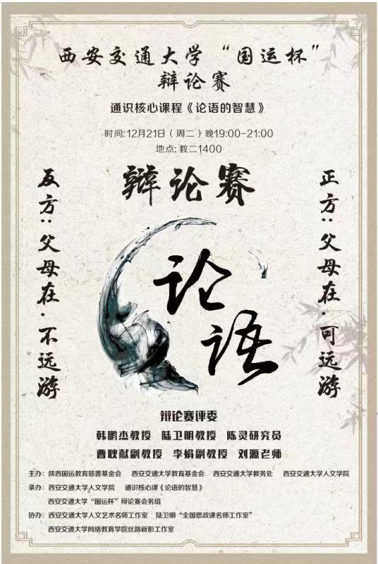 《论语》里仁篇有言,父母在,不远游,游必有方。这一句道出了千古以来中华的一种美德,孝。孝是我们中华传统文化中一个重要的概念,孝敬父母牵系着我们每一个人最柔软的内心,诉说着我们最朴素的互换。一句孔府家酒让人想家的广告词牵动多少游子,一句常回家看看又拨动多少人内心的心弦。我们抑或在外求学工作,父母在我们的记忆里只有冬夏,再无春秋,抑或回到家里也偶尔把最坏的情绪展示给父母,当真如《论语》所说德色难。今天,我们听听台上的双方辩手为我们剥丝抽茧,说一说父母在究竟是否应当远游。