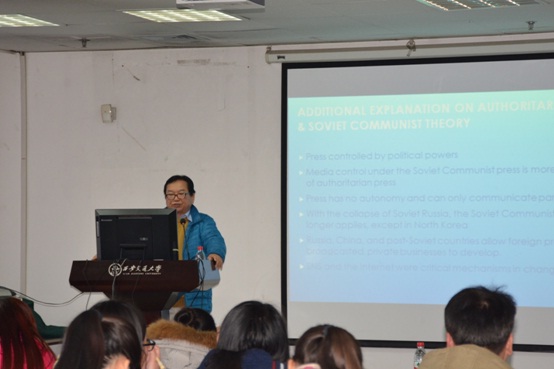 讲座一开始,崔教授以其在教学中亲身经历的有趣故事作为开场白,把同学们引入了此次讲座的主题。在讲座中,崔教授首先为我们讲解了四种传统的报刊理论:自由主义理论,社会责任理论(民主参与理论),权力主义理论和苏联共产主义理论。然而,崔教授指出,在当今瞬息万变的媒体环境中,这四种理论对推动媒体行业的发展已不再具备适用性。由此,他提出了第五种新理论,即以福利为导向的媒体理论。这一新理论包括四个具体内容:政治过程中无固定组织机构性质的形成;媒体与受众关系型;媒体通过信息为受众提供具体的实际利益;最大化日常生活信息作为第一个议程:健康,环境,健康,生态信息等。最后,崔教授在一系列论证的基础上呼吁,媒体所需要做的,是致力于与受众共同解决以福利为导向的事务,而不是热衷于与高层政客的互动。