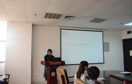 最后,学院团工委书记耿嘉敏老师对本次会议作了最后的总结陈词,对组织本次会议的所有组织者表示感谢,对研究生会的工作成绩表示肯定,对新一届研会工作表示大力支持,同时也对新一届研会成员寄予厚望。在座的研会成员个个精神饱满,表现了对以后开展研会工作的信心与决心。