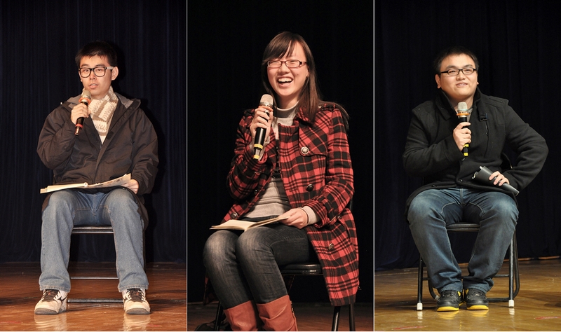 学生标兵董宇卿(左)、冯梦璐(中)、王洪恩(右)同学向学弟学妹们介绍学习心得和体会