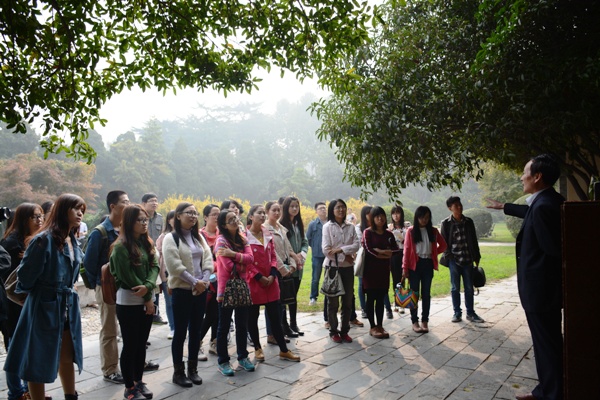 卢教授首先带领大家从学校北门开始参观之程,向同志们详细地解读了北门整体构造所包含的文化意蕴。进而一路向南,依次参观了饮水思源、校友文化展廊、腾飞广场、钱学森图书馆、东花园、西花园、科学馆、四大发明广场、东亭等校园文化景点,聆听了发生在交大这片土地上的传奇故事,品味了交大西迁的魄力和精神。参观过程中同志们个个受益匪浅,感慨万千。尤其是当卢教授深情介绍到彭康校长的事迹时,大家深深地被彭康校长光辉的一生和为发展我国高等教育事业鞠躬尽瘁的崇高精神而感动,有些同学不由地热泪盈眶,在这样的情感氛围之下,卢教授倡议并组织同志们对彭校长行三鞠躬礼,表达了对老校长的缅怀和敬仰之情。