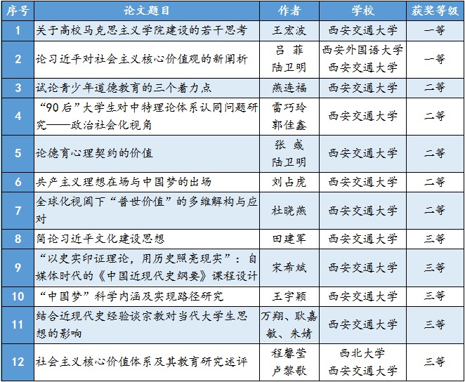 此次论文评选活动由省委高教工委主办,陕西高校思想政治教育研究会组织开展,旨在发现人才,表彰先进,全面推动我省高校思想政治教育研究工作。此次活动共有来自全省64所高校选送的301篇论文参评,最终评选出一等奖论文10篇,二等奖论文38篇,三等奖论文89篇。