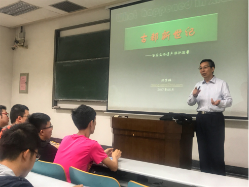 6月7日上午10点,C105教室里100余名能动专业的大一学生在本学期《中国近现代史纲要》的最后一堂课上,迎来了一位新鲜面孔——西安市文物局局长郑育林。“看到你们,我也想起了30前年我坐在教室里面学习的场景。作为交大的校友,我将在这里给我的老师,给我的校友汇报我近20年在西安市工作的作业。”郑育林局长随即抛出今天的主题:古都新世纪——西安文化遗产保护报告。