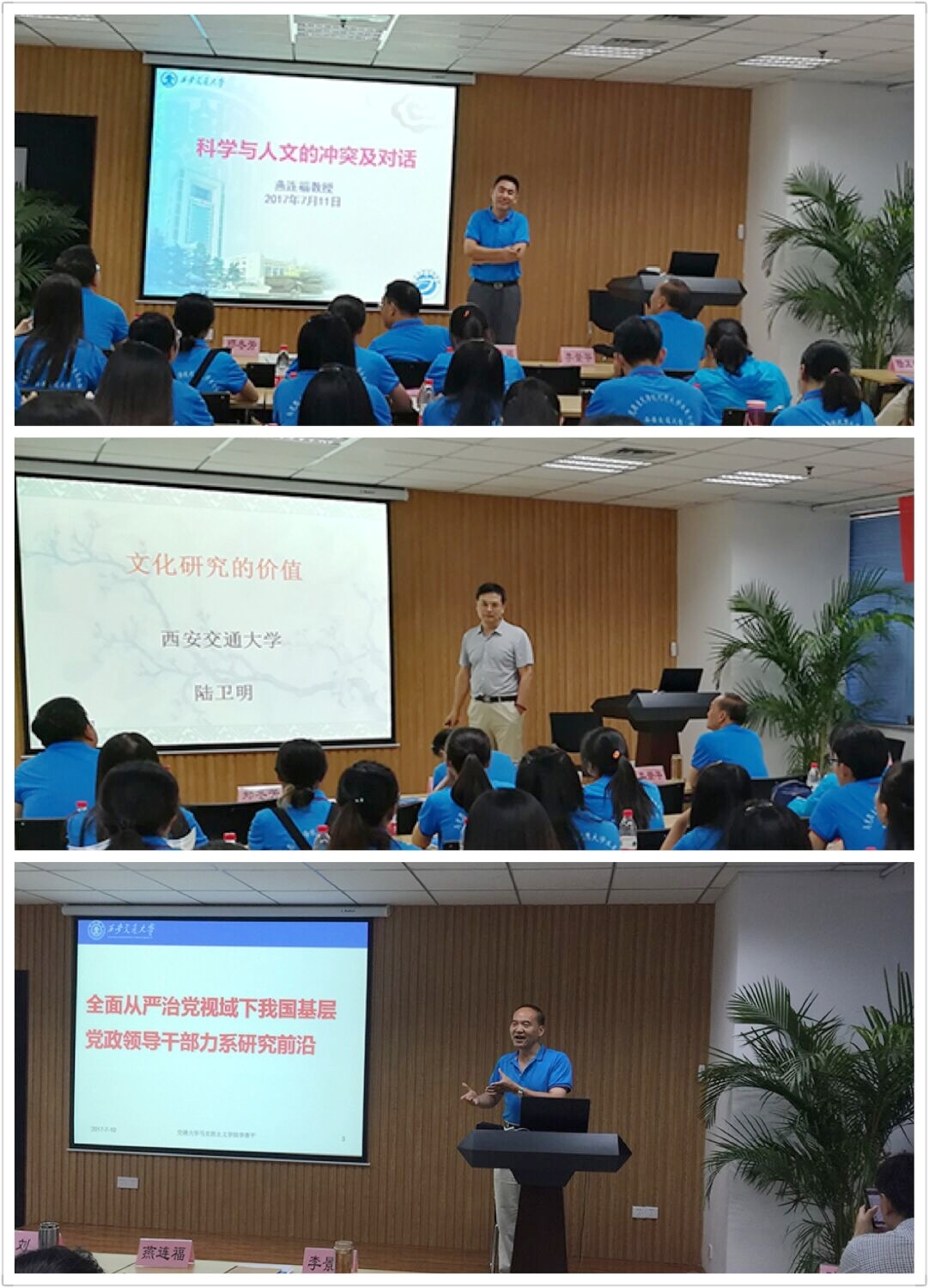 开营仪式的下半段是三场充分体现我院科研实力与特色的专题讲座。首先,院长燕连福教授做了题为“科学与人文的冲突与对话”的讲座。燕教授站在哲学的高度仔细剖析了科学与人文之间对话的必要性与重要性,进而着重提出了在科学与人文对话的各个环节,都需要注入马克思主义的思想与方法。接下来,陆卫明教授结合自己对中国传统文化的深入研究做了题为“文化研究的价值”的报告。陆教授通过生动形象的例子充分论证了文化的重要功能以及文化研究的重要价值,他强调“文化是明天的生产力”。最后,李景平教授做了题为“从严治党视域下我国基层党政干部力系研究前沿”的讲座。李教授的讲座从研究背景和问题的提出、概念界定和相关理论、研究设计、调研方案、统计分析和结论展望这六个方面,全景式地向营员们展示了科学研究的全过程。之后,三位教授与营员们进行了互动交流。中午12时,刘儒副院长宣布开营仪式圆满结束。