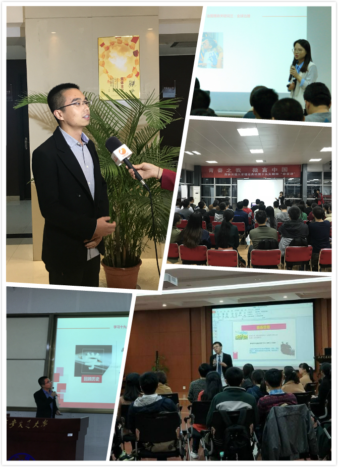 “微宣讲”活动在我校南洋书院拉开帷幕,时至今日,四位同学分别在南洋书院、崇实书院、仲英书院、研究生党支部以及我校西校区新干新秀班等地进行了7场以上的“微宣讲”活动,并从“弘扬担当精神”、“坚定理想信念,勇担青春使命”、“共产党宣言背后的故事”、“习近平七年知青岁月给我们的青春答案”等角度入手向广大学生党员、本科生班干部进行讲解与分享。活动不仅获得了广大师生的一致好评,同时也引发了中国教育报、人民网、中国共产党新闻网、光明网、中国政协网、凤凰网、陕西日报、网易新闻、陕西传媒网、陕西宣传网、华商报、西安日报、三秦都市报等多家社会主流媒体的相继报道和持续关注,中央电视台、陕西卫视等多家媒体也相继对我院师生进行采访。
