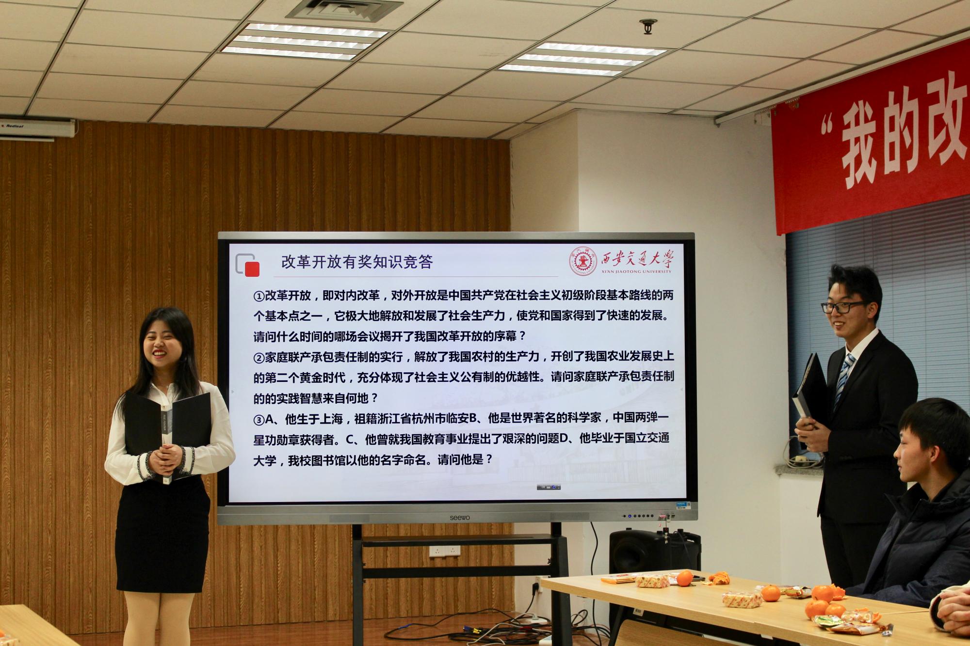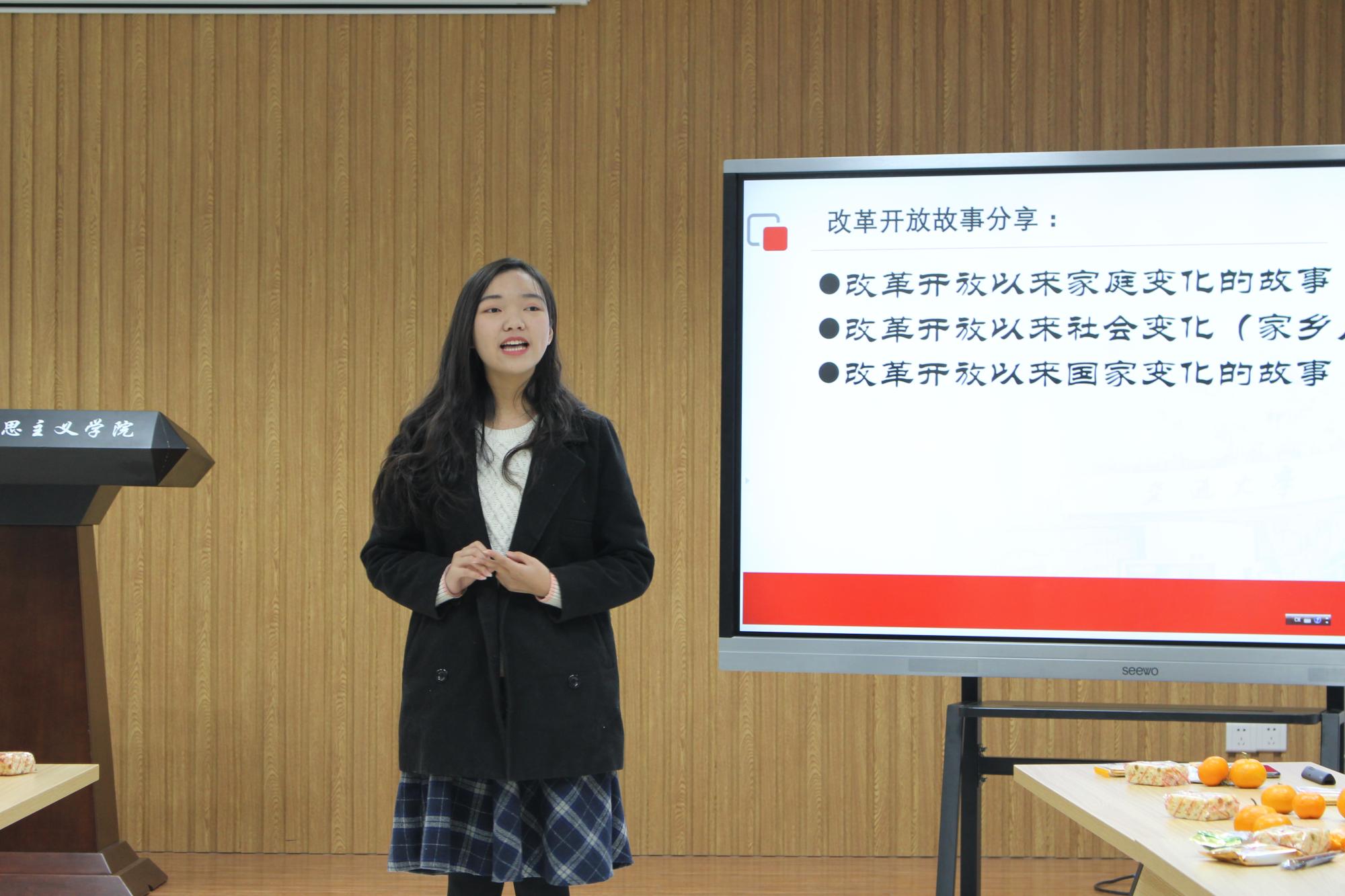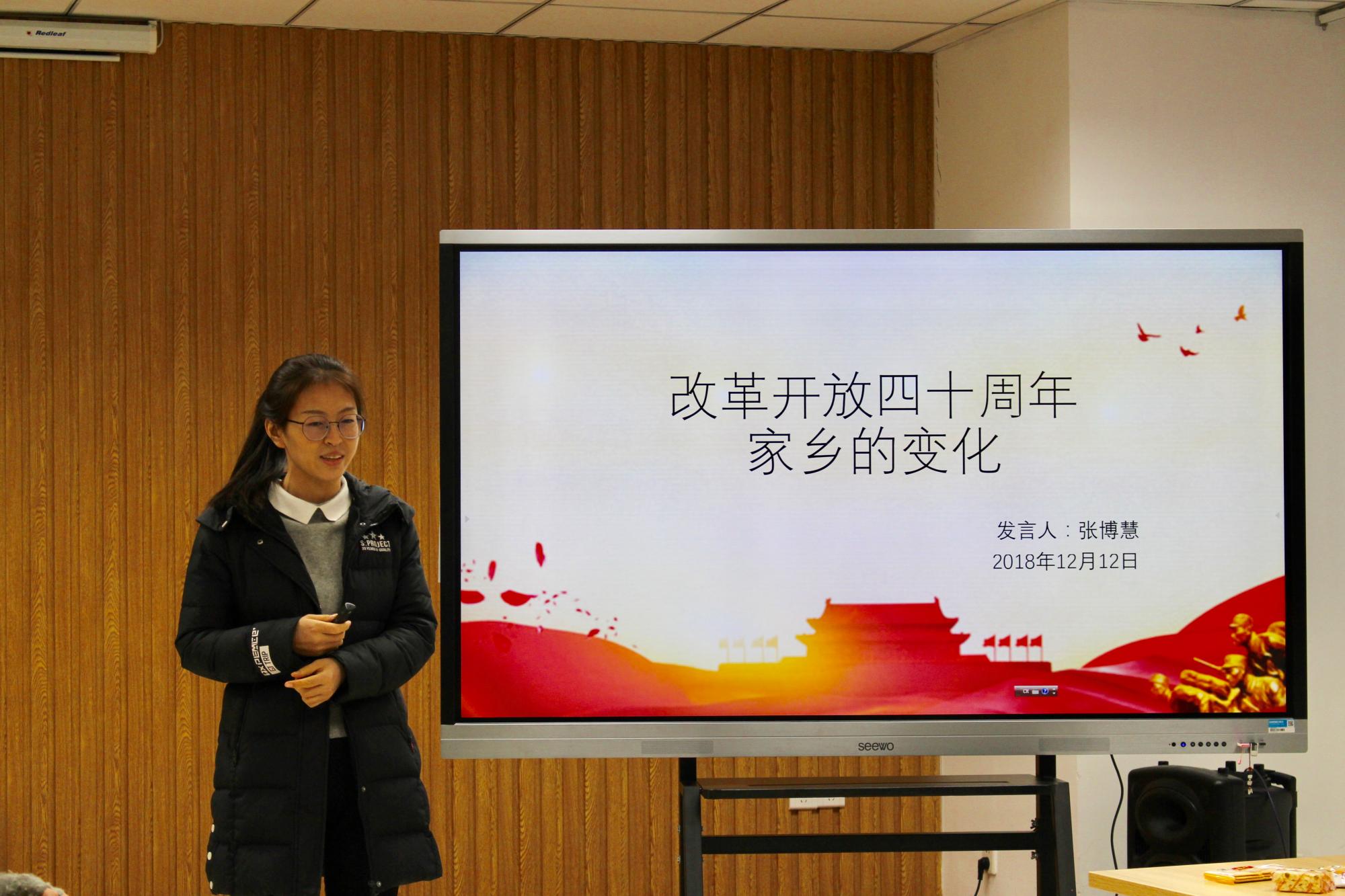 随后伴着音乐《在希望的田野上》,思政61班的何莹同学和张博慧同学分享了自己的改革开放故事;伴着音乐《春天的故事》,马理论51班的高雅同学回顾了她家乡的体育事业的发展;在《走进新时代》的音乐声中,思政71班的刘谋恩和任晋辉同学也将自己的童年趣事分享给大家。在知识问答环节同学们争先恐后地回答问题,答题的结果也展示了大家的专业风采。在自由发言环节,马理论51班的彭随缘同学和文试82班的王鹏起同学既谈到了改革开放的成就,也谈到了我国目前面临的危机与挑战,并号召大家好好学习,为国家的发展助力。