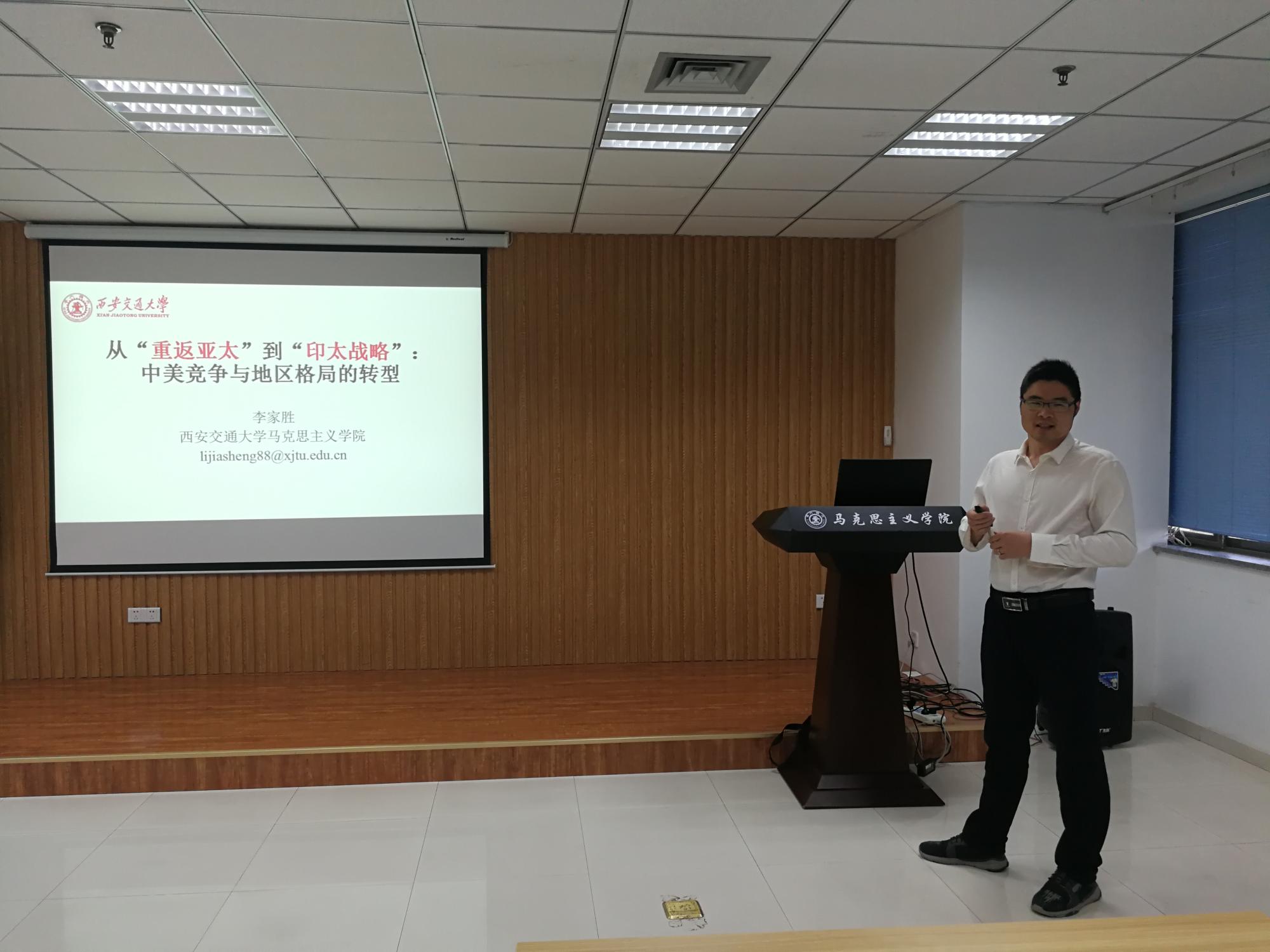 思政所讲师李家胜作关于美国“印太战略”的报告,讲座由学院办公室主任高涛主持。