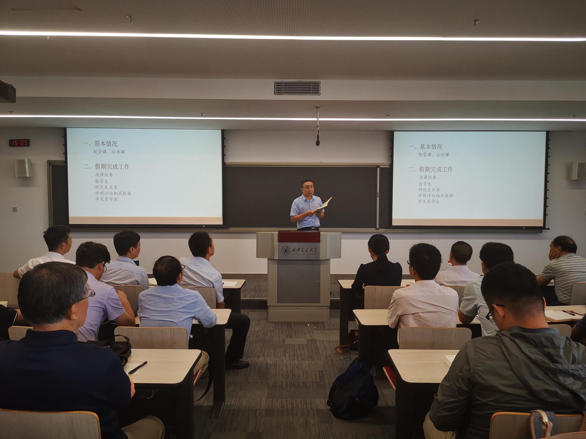 燕连福院长对暑期以来的工作进行了总结和回顾,对学院教职工暑期在进驻创新港、思政课教学、人才培养、科学研究、学科建设、国际交流、宣传及和社会服务等方面取得的做出的工作进行了肯定,并对下半年工作进行了部署和安排,他指出全院要在创新港建设一流的研究院、一流的学科、一流的人才队伍、一流的教学工作、一流的科学研究、一流的人才培养、一流的国际交流、一流的社会服务,紧抓新时期历史发展机遇,在创新港的建设中做出新的贡献。