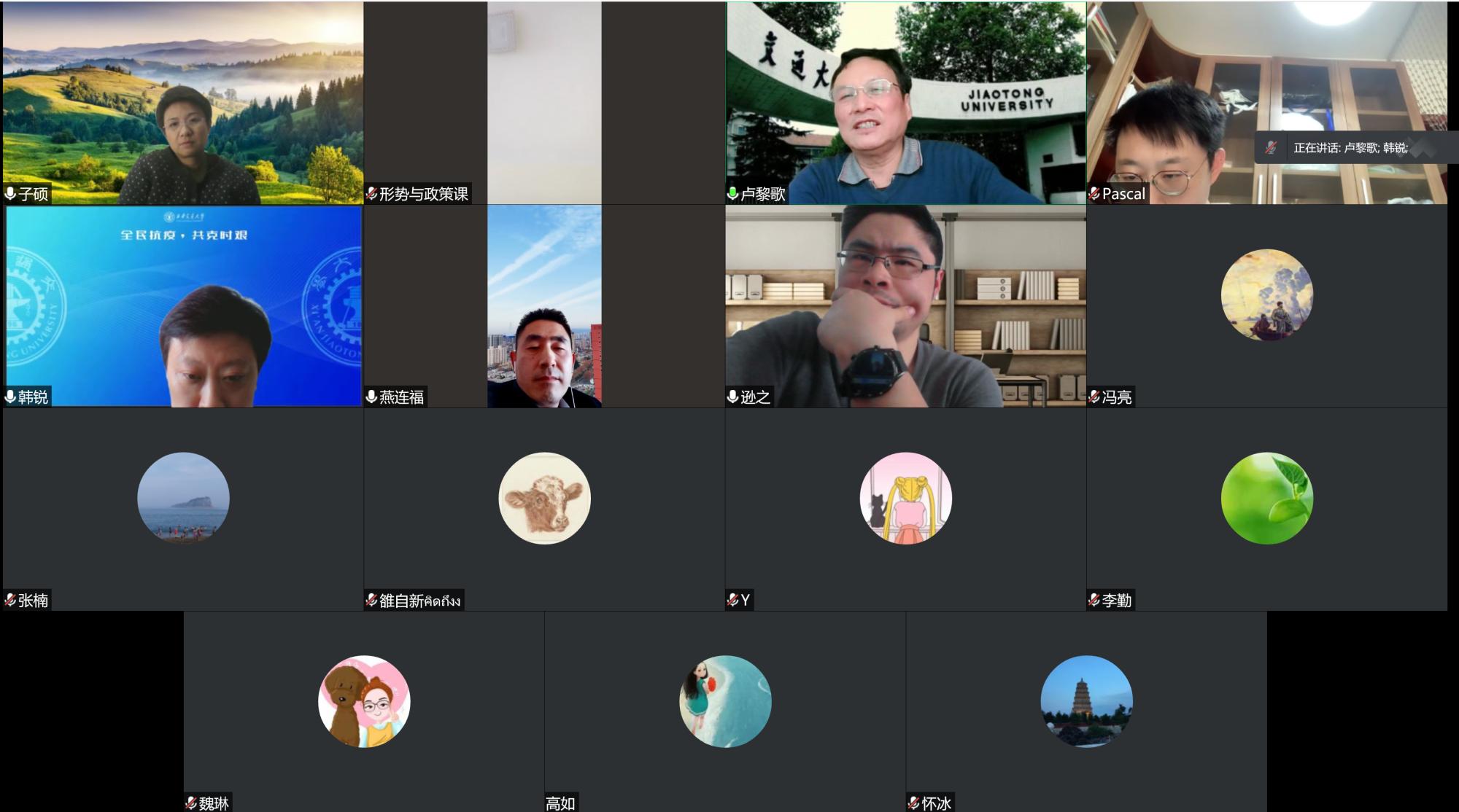 杨华老师通报了思政所教师负责的“思想道德与法治”“形势与政策”“生命与伦理”“医学伦理学”等课程及考核的进度,思政所教师重点研讨了“形势与政策”课的考核办法,提出将“形势与政策”课规范化、精细化管理的思路与方案。燕连福院长就近期疫情防控形势及学校学院有关规定予以说明,要求各位老师务必做好个人防护,配合各级防控要求。韩锐副院长鼓励年轻老师在疫情防控期间继续积极申报各类基金项目,并指出学院将继续大力支持,争取在科研立项方面再创新高。