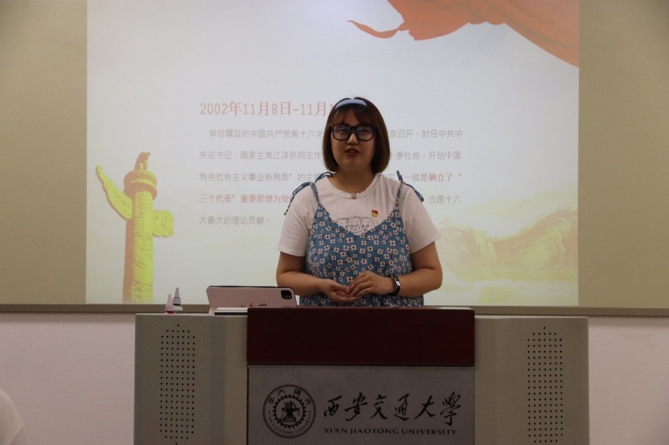 任娟同学以《我和我的祖国》电影片段《回归》为抓手,带领大家重回24年前的1997年7月1日,感受香港回归祖国的振奋人心时刻;李楠同学从形成背景、提出过程、科学内涵以及历史地位四个方面出发为大家系统的阐释了2002年7月1日提出的“三个代表”重要思想;