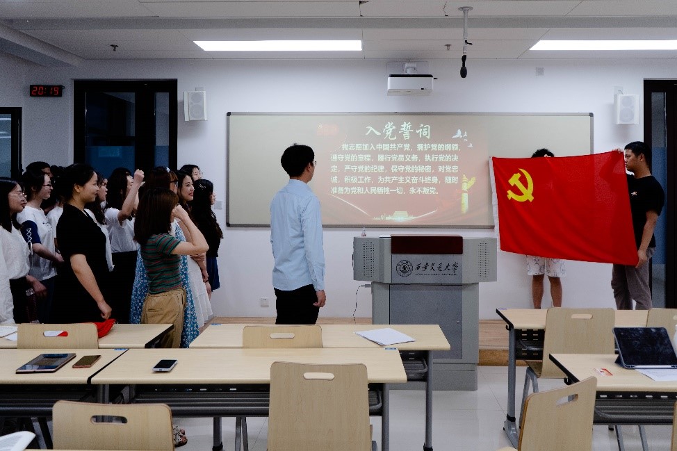 新时代的学子,深入贯彻落实习近平总书记重要讲话精神。在中国共产党百年华诞之际,参加学习的支部全体党员同志重温入党誓词,面对党旗庄严的宣誓,回忆自己的入党初心。