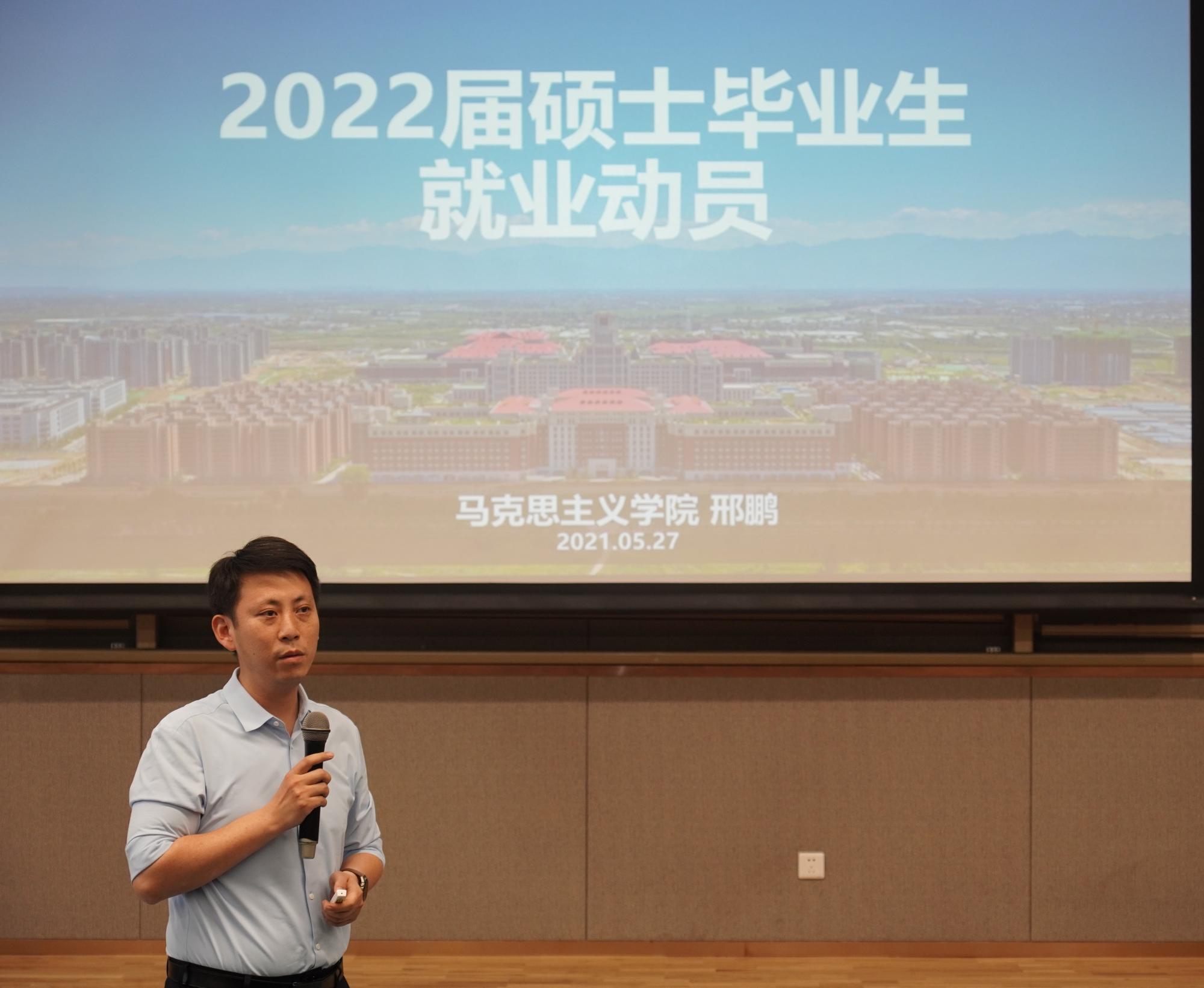 邢鹏首先做毕业生就业动员。他指出,同学们应结合自身专业特点,首先树立到祖国最需要的地方、到基层、到边疆建功立业的决心与信心,要在建设中国特色社会主义伟大进程中,实现自身价值的升华。他详细分析了升学和就业两个毕业方向的基本要求,梳理了本学科专业毕业生去向较为集中的就业方向,为同学们规划了就业求职时间轴。他鼓励同学们尽早确定目标、多做储备;还要注意在求职的过程中不要给自己过多设限,积极结合自身情况调整求职观念,力争全体实现高质量就业。