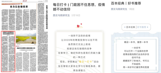 疫情期间,研究生李怡莎等同学积极在《陕西日报》(理论版)等主流刊物执笔发声,共同战疫。3月9日,教育部社科司和人民网共同举办“同上一堂疫情防控思政大课”线上直播。马院硕博研究生作为全校思政公共课助教,积极组织学生在线观看疫情防控思政大课,直播结束后,在QQ群、微信群与同学们共同探讨课后感想,传播正能量,引导舆论。助教郝敏表示,大事难事看担当,危急时刻显作为,中国制度、中国智慧、中国精神、中国力量赋予我们自信,马院学子愿与祖国同频共振,以青春之名,为世界之光,不负时代使命,勇挑责任重担,在奋斗担当中谱写大写的青春。