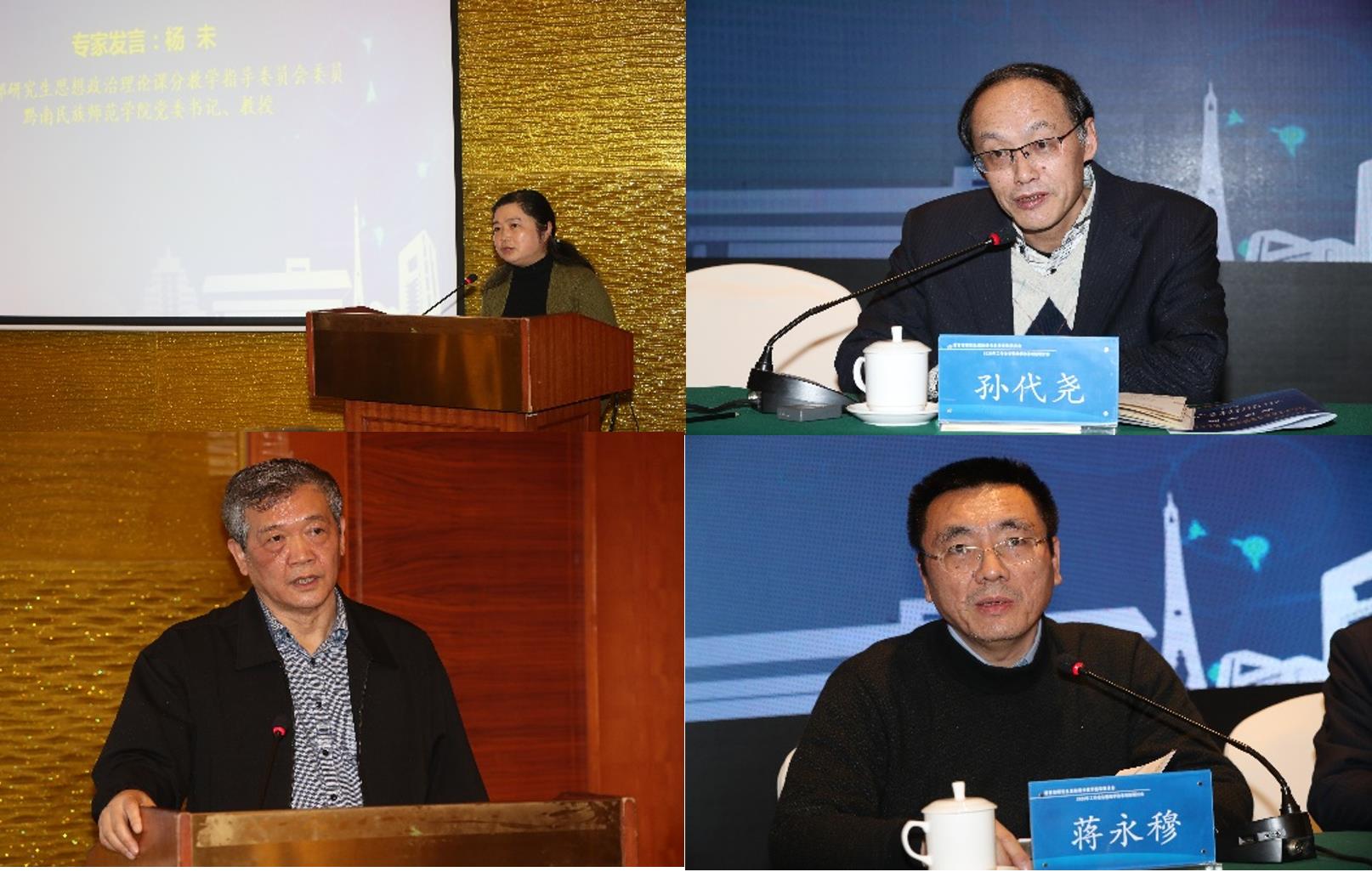 王宏波教授从“三理贯通”即政理学理事理角度分析了研究生思想政治理论课的教学理念与方法。东北林业大学教授陈文斌委员就教材问题;黔南民族师范学院党委书记杨未委员从注重问题导向、目标导向和结果导向的维度;北京大学教授孙代尧委员就政治性和学理性的统一;中山大学教授钟明华委员就博士生培养质量问题;四川大学教授蒋永穆委员就习近平新时代中国特色社会主义思想概论课的开设;天津师范大学教授王秀阁委员就研究生思想政治理论课入脑入心问题;吉林大学教授邵彦敏委员就平台建设;云南大学教授李兵委员就用学术讲政治;北京化工大学张明国教授就混合式教学模式问题等做了主题发言。