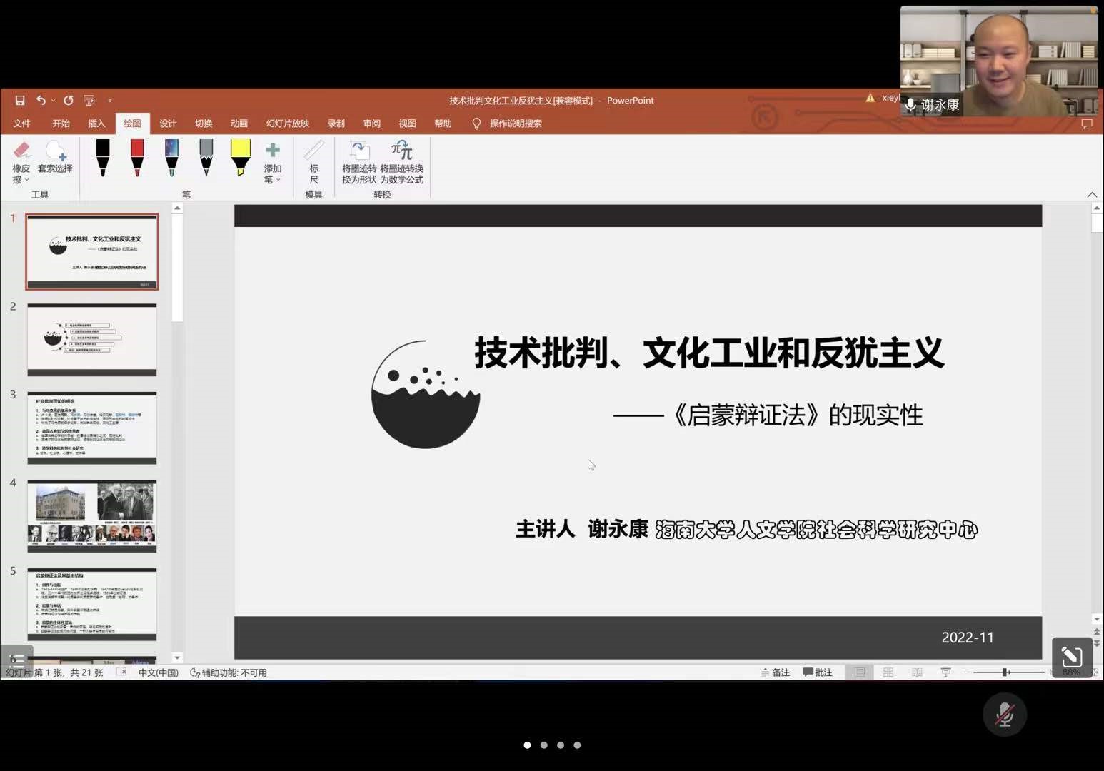 2022年11月16日下午,海南大学人文学院社会科学研究中心谢永康教授应邀为广大师生作题为“技术批判、文化工业和反犹主义:《启蒙辩证法》的现实性”线上学术报告。本次报告由国外马克思主义研究所所长杨栋教授主持。