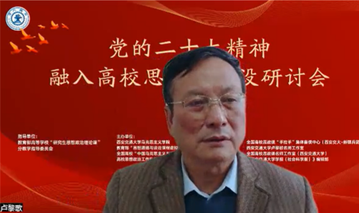 二级教授卢黎歌做总结发言。卢黎歌教授再次感谢了各领导、老师的发言和分享。首先,他提出学懂、弄通党的二十大精神的科学方法就是习近平总书记提出的“五个牢牢把握”、“三个全面”下功夫、“三个深刻(加深)”以及“九个深刻领会”,要在学习党的二十大精神的基础上掌握新思想、新论断、新部署和新要求。并对党的二十大精神融入“德法课”提出了三个标准:一是彼此融合;二是形成新的内在结构;三是具有新的功能或效果。最后,卢黎歌教授以党的二十大精神融入“德法课”的八个原则和四个方法结束了他的发言。