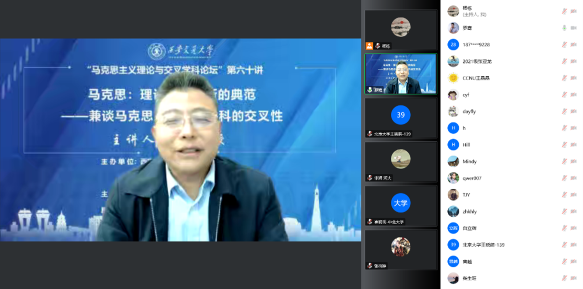 师生作题为“马克思:理论综合创新的典范——兼谈马克思主义理论学科的交叉性”的线上学术报告。本次报告由国外马克思主义研究所所长杨栋教授主持,校内百余人在线参加了此次报告会。