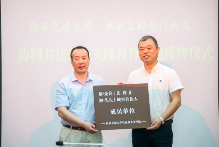 副院长陈建兵、新城区解放门街道党工委书记郭珮琦出席授牌仪式,解放门街道党工委副书记韩靖主持活动。马克思主义原理研究所所长李永胜,马原所联合党支部书记樊晓燕等师生10余人、解放门街道办工作人员及下属七个社区负责人参加活动。