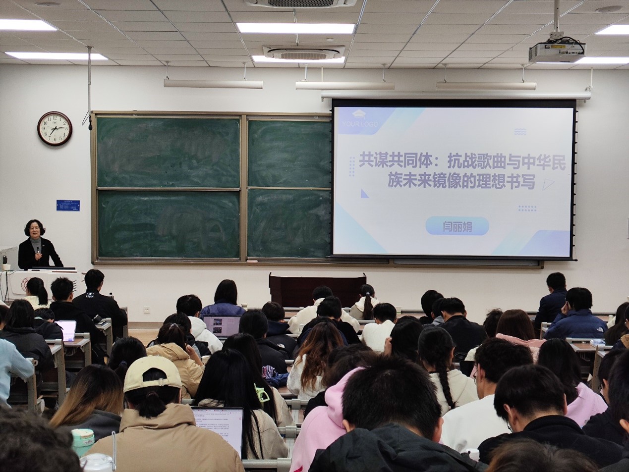 本次讲座主要围绕抗战歌曲对推动中华民族团结统一、促进民族意识形成的作用等方面展开。闫丽娟教授首先从“中华民族共同体”的概念切入,为与会师生梳理了近代以来有关中华民族多元一体格局的研究。随后,闫丽娟教授深入浅出地剖析了诸多音乐家在抗战歌曲中对中华民族未来理想面貌的书写。她指出,抗战歌曲绘制了一幅包罗“新战局”“新民众”“新社会”“新国家”和“新世界”的全新图景,展现了战时环境下音乐界人士的历史担当与创作自觉,推动了中华民族观念由“小众共识”到“大众常识”的升华。