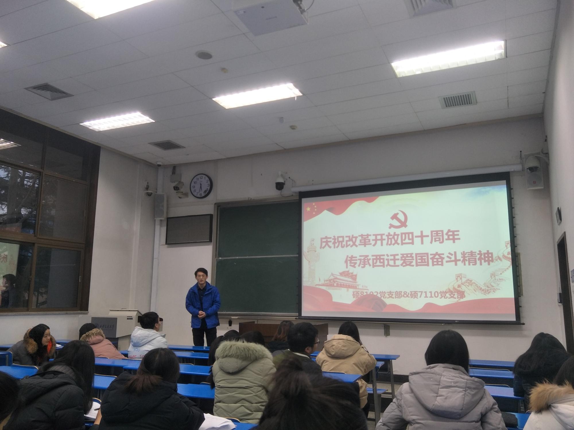 12月29日下午,硕8102党支部与硕7110党支部在主楼A102开展了“庆祝改革开放四十周年 弘扬西迁爱国奋斗精神”主题教育活动。此次活动特别邀请筑梦社成员黄佳慧、陈枫和李田甜进行宣讲。会议由硕8102党支部书记刘阳科同志主持,硕8102支部和硕7110支部全体成员参加。