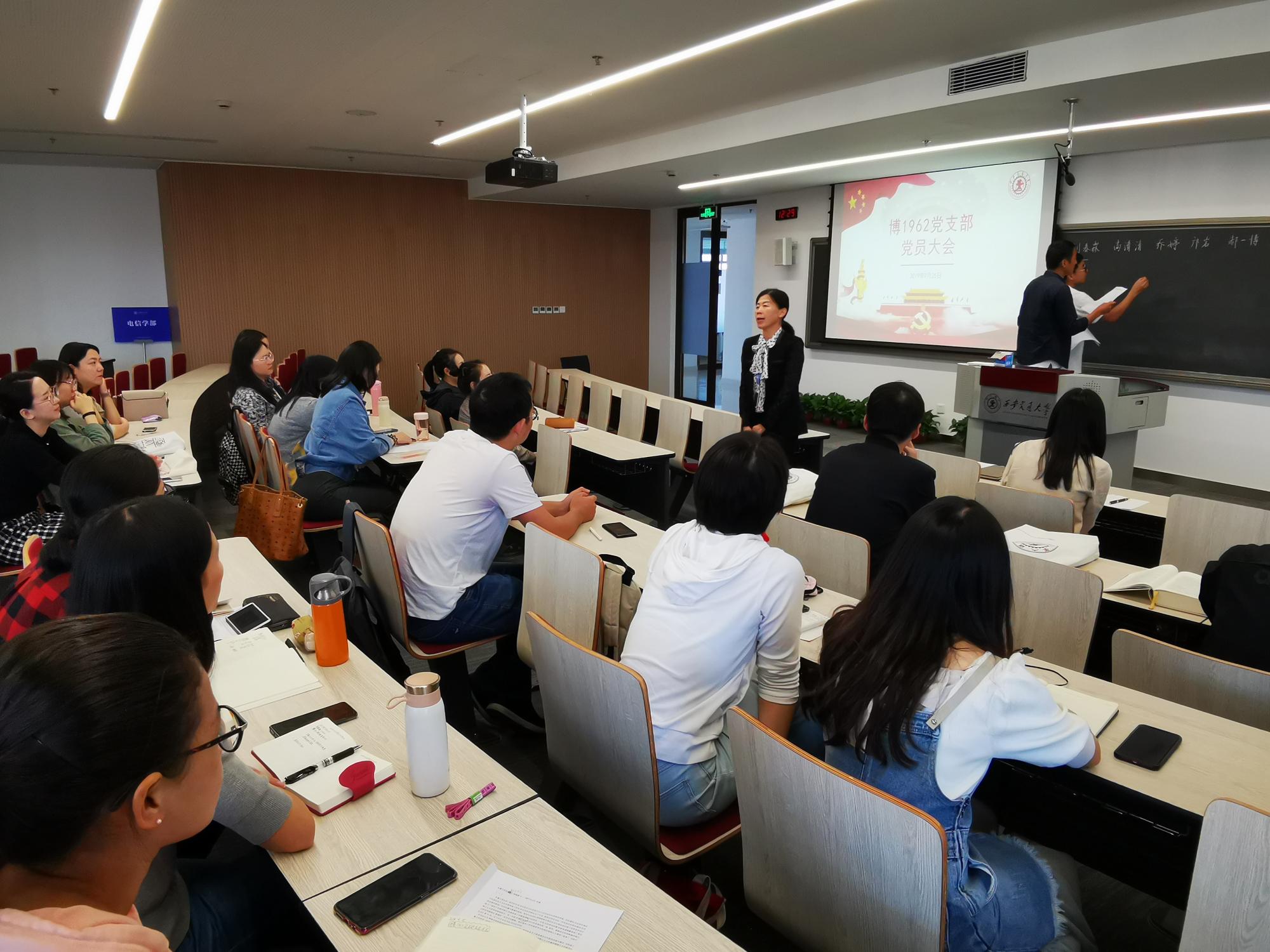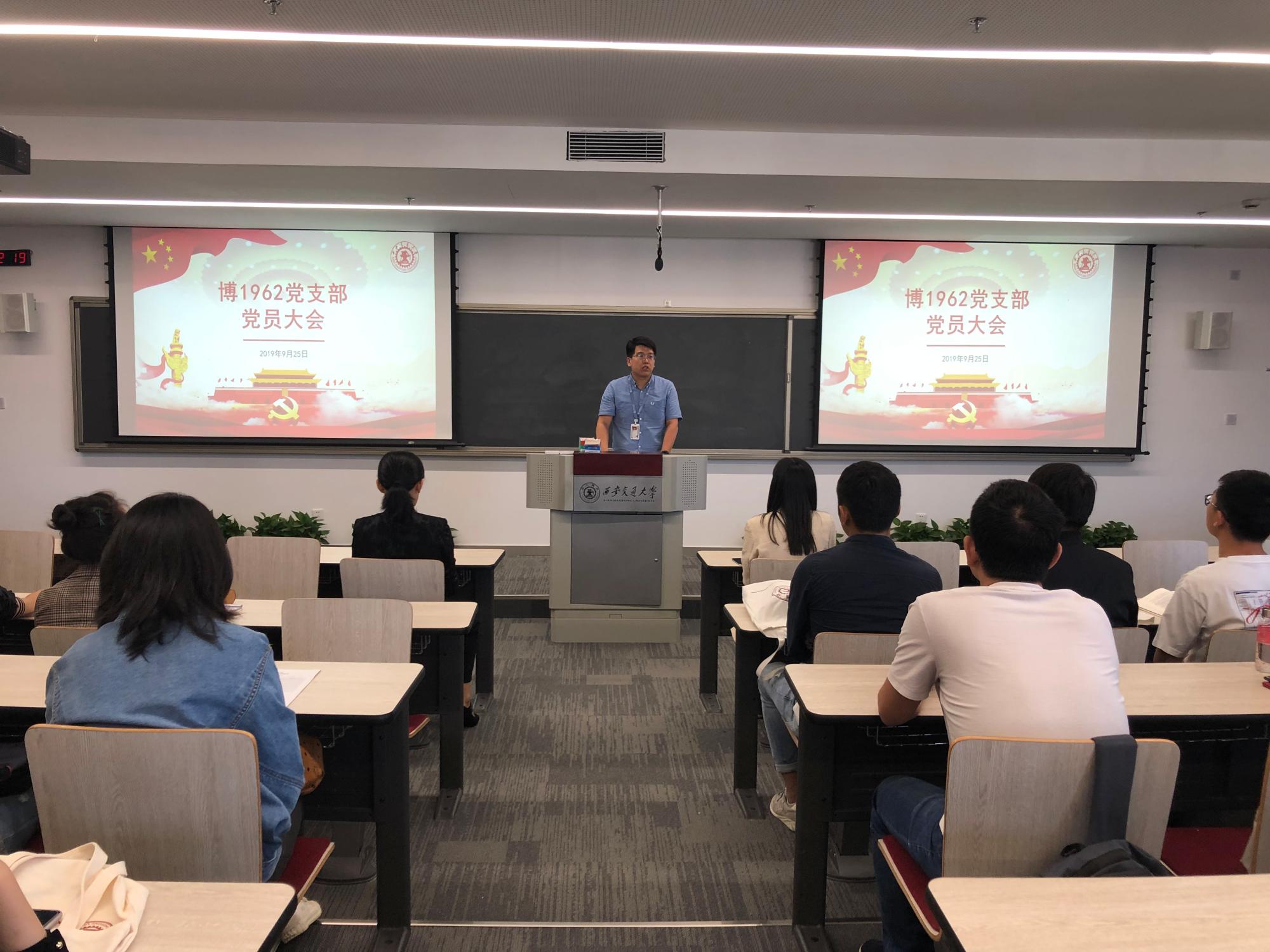 博1962党支部成立大会于创新港涵英楼6106教室顺利举行。学院党委书记苏玉波、学院分党委秘书岳鹏飞、辅导员耿嘉敏以及博1962党支部23名党员(5人请假)参加此次会议。本次大会共有两项议程,一是选举产生党支部委员,二是由学院党委书记苏玉波对全体党员提出“不忘初心,牢记使命”主题教育的学习要求。会议由学院分党委秘书岳鹏飞主持。