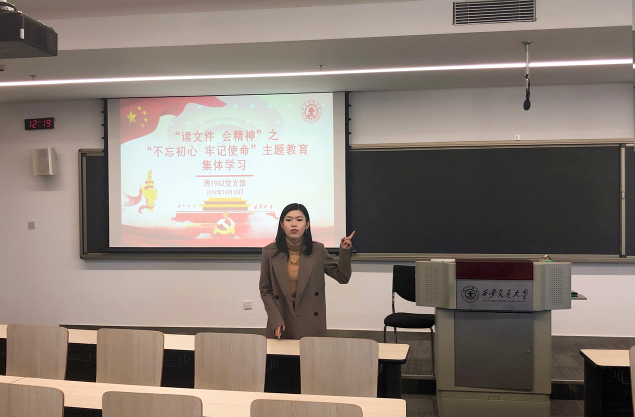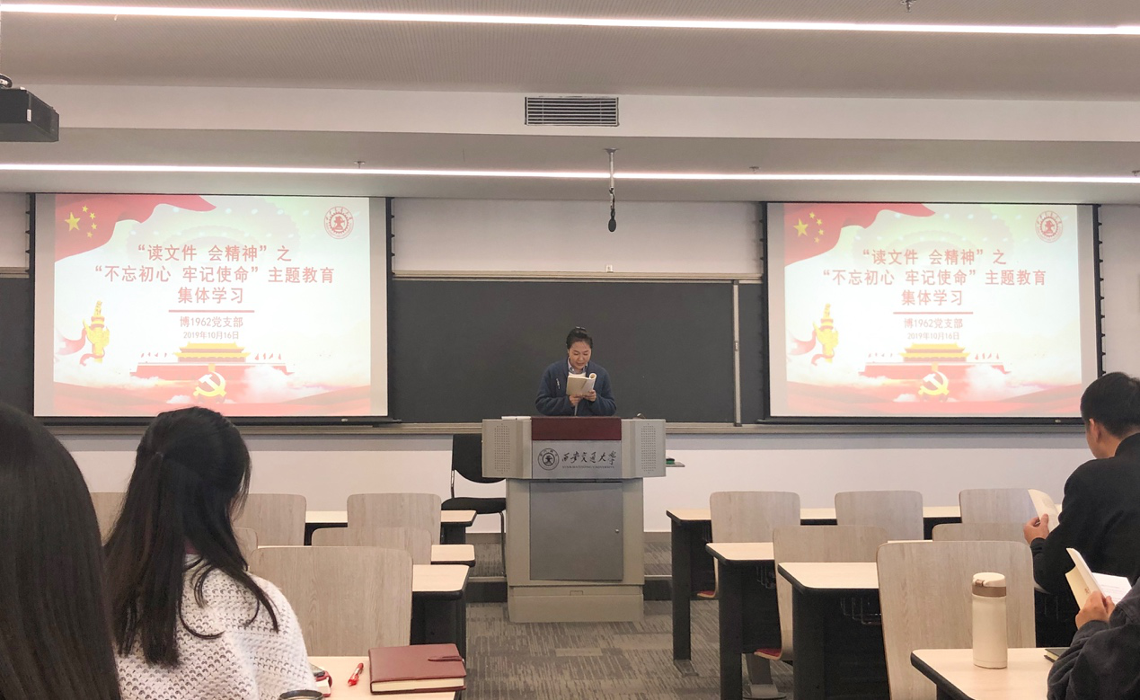 为进一步领会“不忘初心 牢记使命”主题教育的精神要求,博1962党支部于10月16日在创新港涵英楼6106开展了主题为“读文件 会精神”的学习活动,辅导员耿嘉敏以及25名党员(2人请假)参加了此次会议。会议由支部书记刘春霖主持。