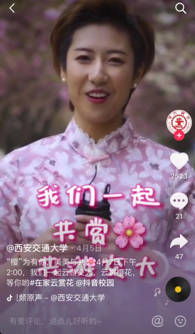 4月7日,钱学森图书馆下落英缤纷,兴庆校区春意正浓,身着一袭绣花旗袍,杨玉垚走在校园中,通过抖音平台带领广大网友云游交大,共赏樱花,为母校庆生。