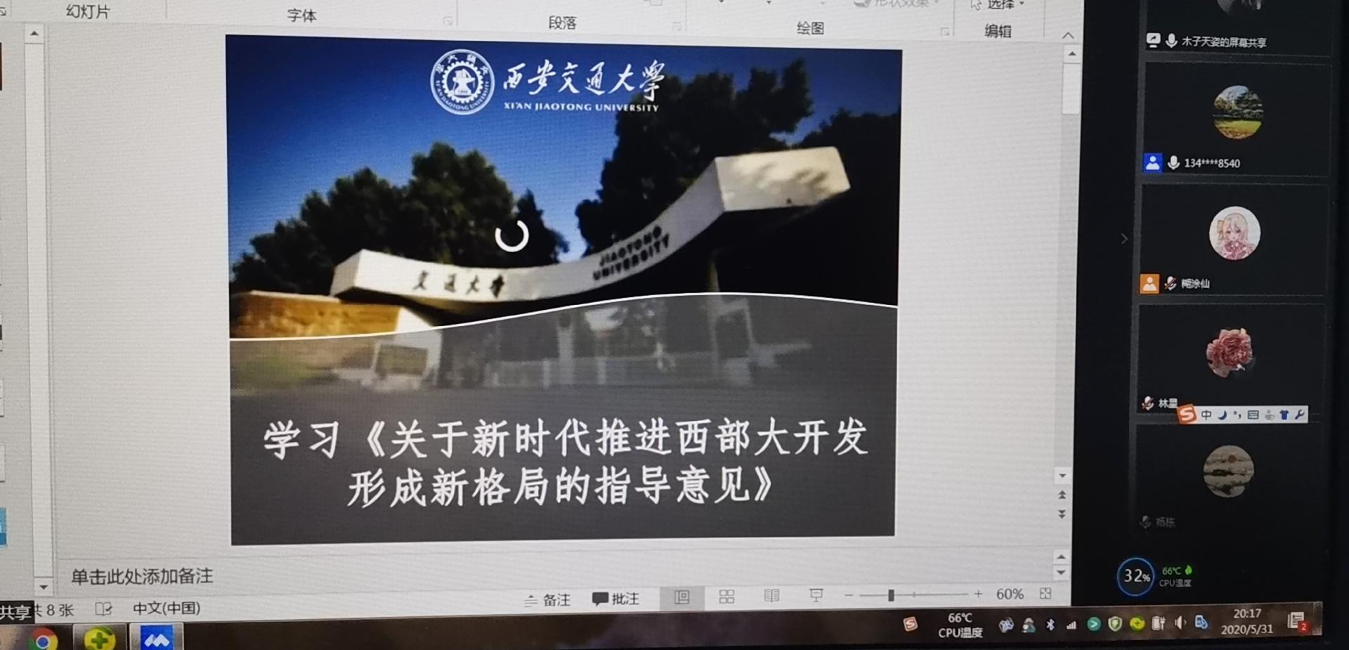 2020年5月15日,学校召开全面从严治党大会,要求西安交大的全面从严治党要坚决贯彻落实好习近平总书记莅校视察的重要讲话,以此为指导,遵循中纪委、教育部、陕西省委要求,把全面从严治党的各项任务落实好。5月17日中共中央 国务院《关于新时代推进西部大开发形成新格局的指导意见》。