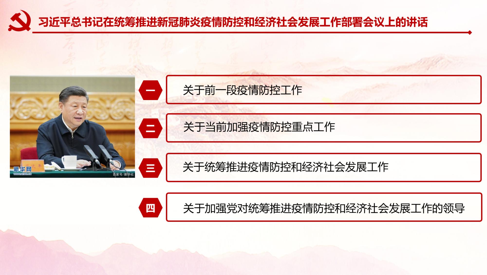 会上,由支部书记岳鹏飞带领全体党员同志共同学习了《习近平总书记在统筹推进疫情防控和经济社会发展工作部署会议上的重要讲话》,分别从疫情发生以来中央领导相关工作动态、前一阶段疫情防控工作总结及加强当前疫情防的7项控重点工作、加强党的统筹领导等方面对讲话精神进行了细致的解读。同时,他还为大家分享了“如何做好上班期间的个人防护工作”,从开窗透气、减少会议、个人健康防护六注意等方面为大家提供了建议。