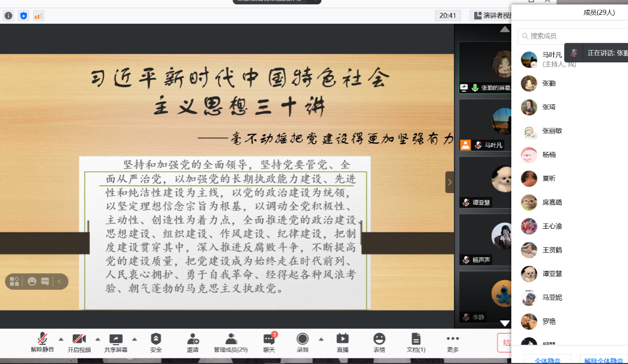 硕9114党支部召开线上组织生活会,集体学习习近平新时代中国特色社会主义思想,分享交流科研学术经验。支部全体成员参加会议,组织委员马叶凡同志担任会议主持人。