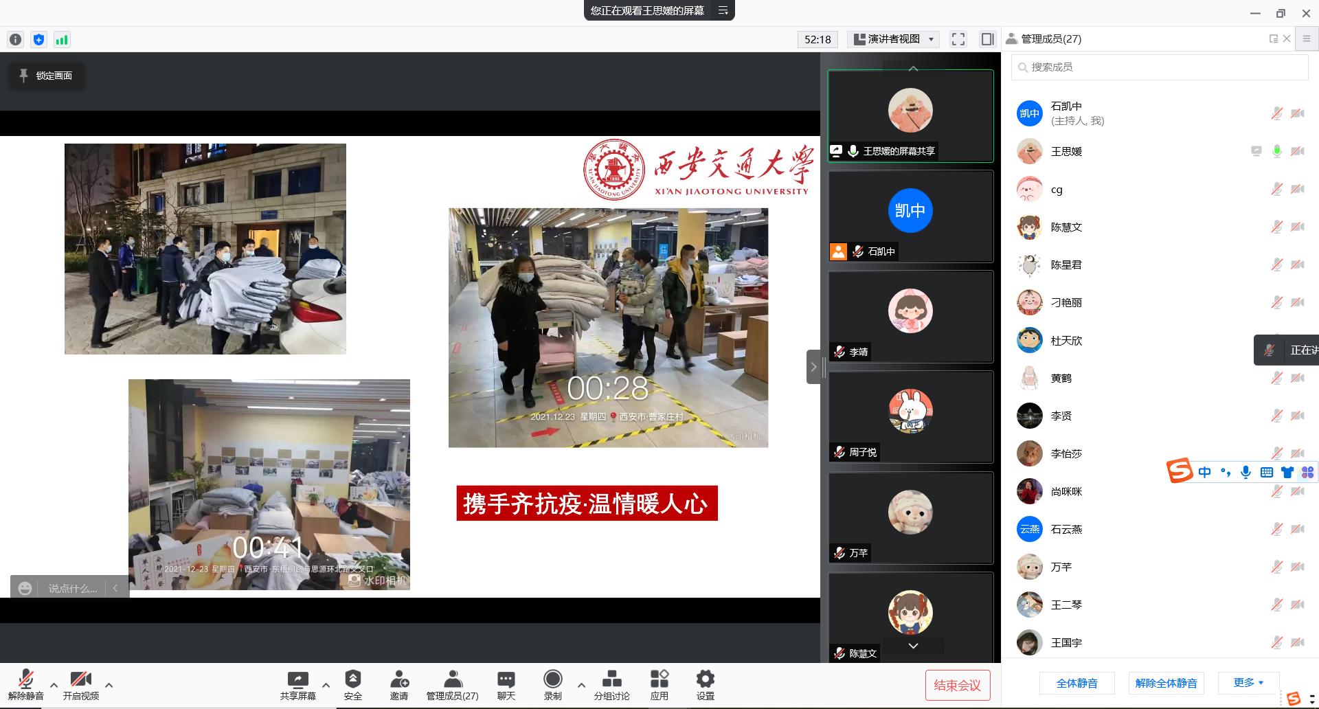 在看完抗疫短片和听完抗疫微宣讲后,支部同志就自身的体会畅谈感受,周子悦表示:“西安疫情爆发以来,交大学子、老师、后勤人员积极参与抗击疫情,彰显着交大人的担当。西安的新增人数不断下降,这是西安人民共同努力的成果,相信西安这座城市很快将再一次鲜活生动起来。”李贤说道:“面对汹涌疫情,全校学生严格遵守学校疫情防控要求,自觉在宿舍进行隔离,部分同学在学习、生活、心理等方面不免会出现一些情绪波动。本次组织生活会为大家提供了一个交流的平台,让大家看到了学校所有同学老师和工作人员在疫情防控中的努力,了解了目前疫情防控总体形势,缓解了大家情绪,更加坚定了战胜疫情、顺利解封的信心”