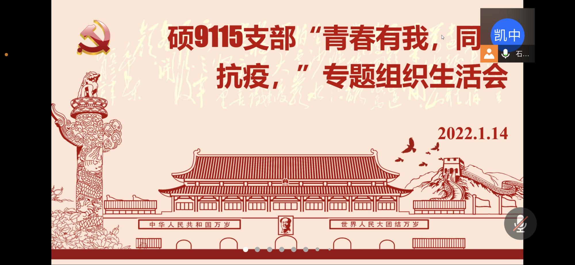 硕9115党支部在线上召开了以“青春有我,同心抗疫”为主题的组织生活会。会议由硕9115党支部书记石凯中主持,支部全体党员以线上方式参加了本次会议。
