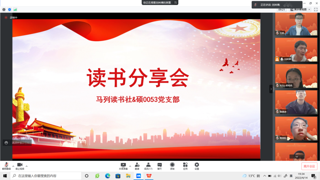 党性是共产党员立身、立业、立德的基石。加强党性修养对于每一个党员来说,都是必须解决好的重大课题。为重温红色历史,培育红色情怀,进一步推动支部党史学习教育常态化,4月14日晚,马列读书社与电气工程学院硕0053党支部通过线上形式联合举办红色经典读书分享活动。电气工程学院硕0053党支部副书记刘林博主持本次分享会。