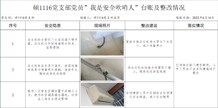 为认真贯彻落实习近平总书记关于安全生产的重要指示,推动《中华人民共和国安全生产法》真正入脑入心,落实到具体行动中,着力提高大家知法、守法、用法能力,硕1116党支部组织开展安全风险隐患自查。同学们围绕校园环境治理、食堂食品安全及卫生工作、宿舍管理、消防设施配置等方面开展自查。支部针对排查出的重大风险和问题建立台账,并及时向学校相关部门建言献策,助推问题整改,进而防范各类安全事件发生,以良好的校园安全环境迎接党的二十大胜利召开。