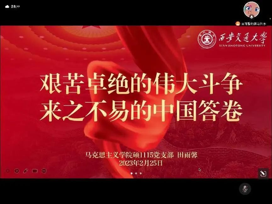为深入学习宣传贯彻党的二十大精神,加强党、团支部组织建设,2月25日晚,硕1115党、团支部在线上召开专题组织生活会。本次会议以“团结奋斗再出发”为主题,由硕1115党支部组织委员田雨馨主持,硕1115党、团支部全体成员共同参与。