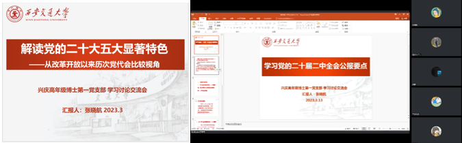 发展对象张晓航带领支部全体成员学习了党的二十大报告和二十届二中全会公报。对于党的二十大报告,张晓航表示,必须突出强调理论创新的引领作用,充分凸显科教和人才的基础性战略性支撑地位,坚定沿着既定方向和路线勇毅前行,紧紧瞄准强起来的奋斗目标,自始至终高扬“团结奋斗”的精神风貌和时代要求。在领读二十届二中全会公报时,张晓航从深化机构改革、学习宣传贯彻党的二十大精神、努力实现今年各项目标任务与响应二中全会号召四大要点系统展开。