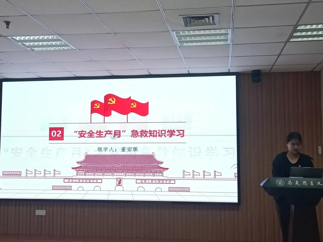 党支部组织委员董安琪为大家介绍了触电、骨折、烫伤、中暑、溺水等相关的急救知识,大家纷纷表示对于安全生产的理念有了更加深入的了解,遭遇紧急情况时的自救能力也有了一定的提升。随后,大家共同观看了禁毒宣传教育相关视频,进一步掌握了抵御毒品侵害、警惕毒品陷阱的相关知识。