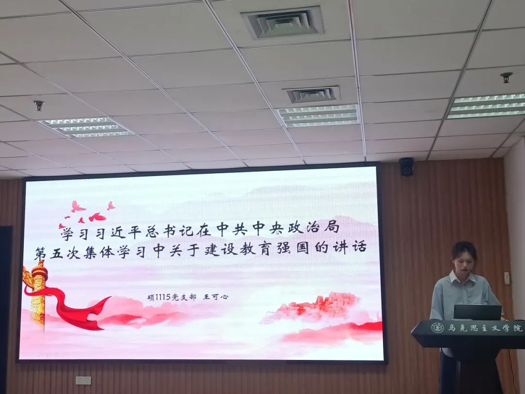 王可心围绕“为什么要建设教育强国”“建设什么样的教育强国”“如何建设教育强国”三个维度,带领大家学习了习近平总书记在中共中央政治局第五次集体学习中关于建设教育强国的讲话,表示广大学子要坚持终身学习的态度,不断提高自己的学术水平与实践能力,为教育强国的建设贡献自己的一份力量。