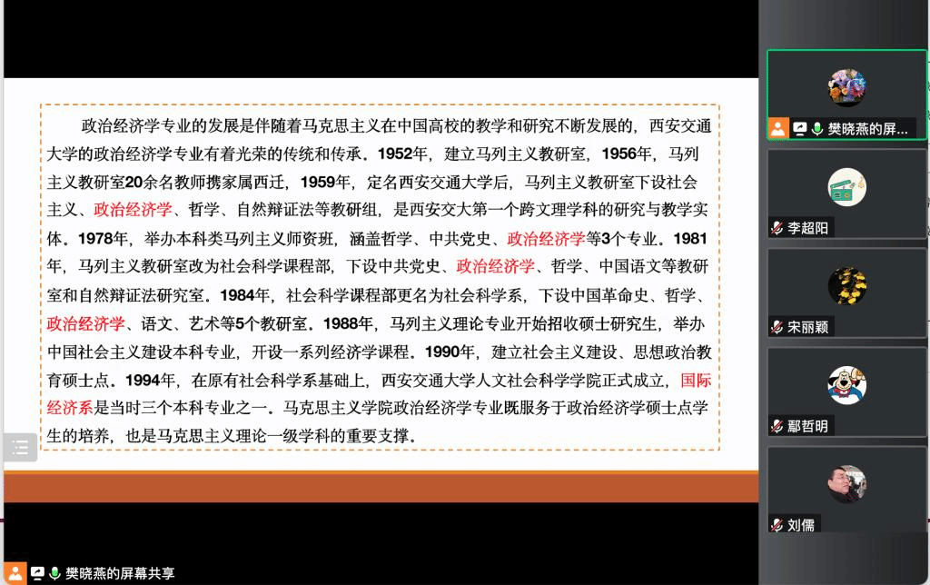 马原所联合党支部书记樊晓燕同志介绍了黑料网 政治经济学学科的历史沿革、学科建设、师资队伍、课程设置、实践教学等内容,从黑料网 思政课主阵地的基本定位出发,提出了在中西方经济学体系的比较和历史与现实的对话中,从历史维度、现实维度、理论维度、实践维度、传统文化维度进行课程思政建设的思路方法。