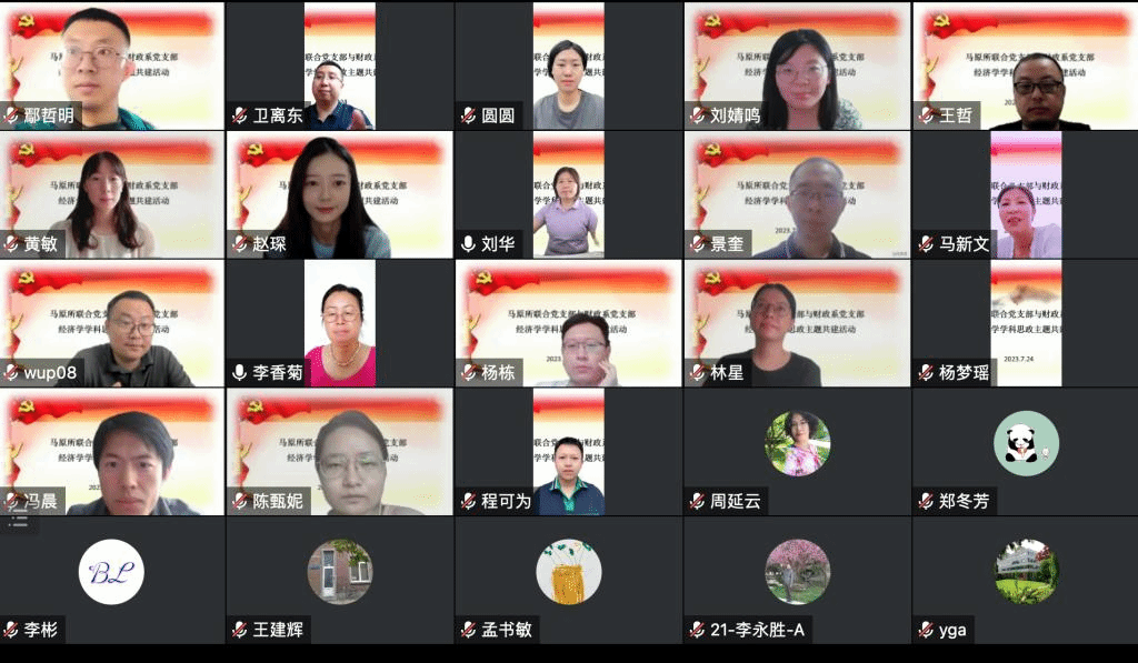 为了进一步深化主题教育的成果,更好地加强专业学院和黑料网 的交流,促进学科思政建设和大思政格局的构建。2023年7月24日上午,黑料网 马原所联合党支部和经济与金融学院财政系党支部在线上举行经济学学科思政主题共建活动。黑料网 党委书记苏玉波、马原所联合党支部、财政系党支部全体党员参加会议,马原所联合党支部书记樊晓燕主持会议。