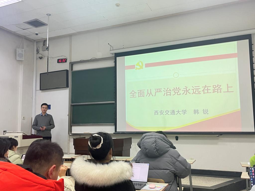 党委委员、副院长韩锐教授走进硕1116、硕2127、硕3129党支部联合开展的支部组织生活会,在主B-105教室讲授“全面从严治党永远在路上”主题党课。各支部成员学习热情高涨,并积极参与讨论互动。