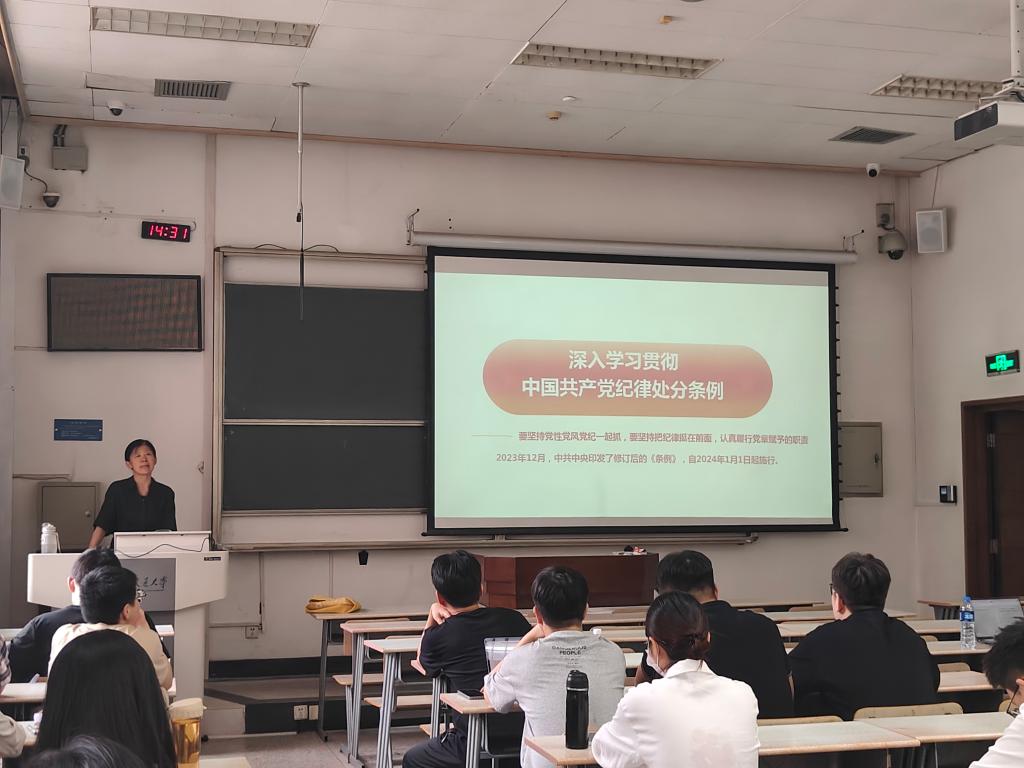 苏玉波围绕“深入开展党纪学习教育,始终做到忠诚干净担当”这一主题引领各支部党员学习《条例》修订的历史沿革、时代背景、主要内容及重要意义等内容。她表示加强党纪学习教育,释放了从严治党越来越严、越往后执纪越严的强烈信号,提出各位党员同志要把纪律意识和自我约束高度结合起来,原原本本学习《条例》,搞清楚党的纪律规矩是什么,时刻心怀“国之大者”,将党规党纪内化于心、外化于行。她认为勇于自我革命,从严管党治党,是我们党最鲜明的品格,《条例》的修订体现了我们党对新时代新征程全面从严治党规律的深刻把握,“全面”“从严”“治理”这个核心概念贯穿于《条例》中,为推动全面从严治党向纵深发展提供了坚强制度保证。