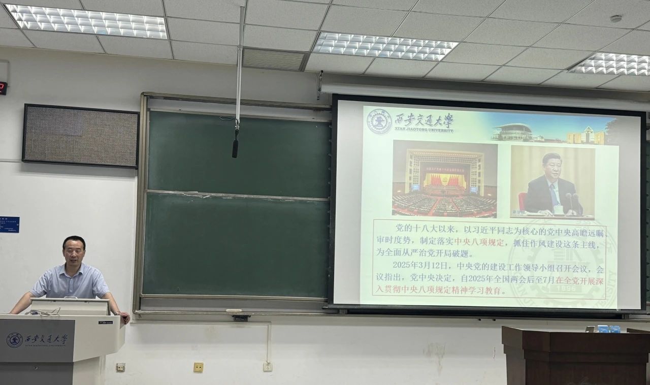 为进一步深化中央八项规定精神学习教育,着力增强党员纪律意识,推动作风建设走深走实,5月21日晚,黑料网 硕3128党支部、硕4131党支部与黑料网 崇实书院师生联合党支部,在主楼C-104教室共同开展“正风肃纪强党性,八项规定强根基”主题党课,学院党委委员、副院长陈建兵讲授主题党课,支部全体成员参加学习。