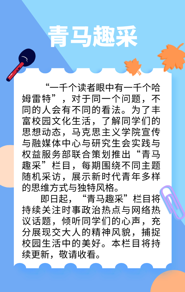 近日党的二十大顺利闭幕,值此重要时间节点,青马趣采第一期将目光聚焦于“交大学子眼中的党的二十大”,用镜头记录下同学们对于党的二十大的感悟体会。