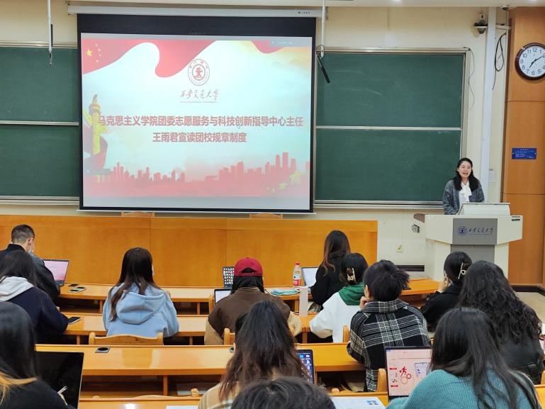 全体成员落座后,王婷从“培训背景、培训对象、培训内容、考核评定”四个方面,为同学们介绍了本年度培训的主要内容。培训以中国共产党第二十次全国代表大会的召开为背景,旨在引导同学们深入学习理解党的二十大精神,促进协同合作,加强理论联系实践,为全面建设社会主义现代化国家贡献青春力量。培训分设“技能培训”“专题讲座”“学术沙龙”“研学实践”四大板块,每部分包含多个子主题,内容丰富、形式多样,切实为同学们学习知识技能,提升综合素质提供机会与平台。王雨君为同学们宣读了团校规章制度,主要涵盖组织纪律、请假出勤、会场要求等方面,并寄语同学们珍惜机会,真抓实干,在学习实践活动中展现自身风采。