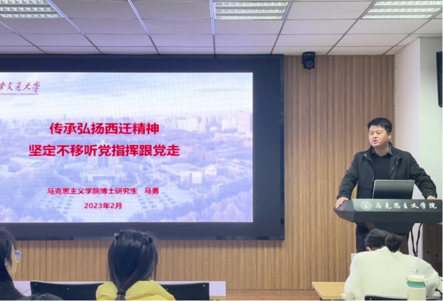 马勇以“传承弘扬西迁精神 坚定不移听党指挥跟党走”为题针对学生工作经历和转博经验进行分享。在学生工作经历上,他分享了自己在交大八年来的学生工作经历,提出学生干部要始终明确自己的定位,时刻不忘自己交大人的身份。他强调,学生干部一方面应该为同学们做实事,解决同学们学习和生活上的烦心事,做同学们的知心朋友;另一方面要有强大的内心,胸怀宽广,把每一项工作都作为自己的事业去完成。在转博经历上,他分享了转博的时间安排和基本要求,建议同学们提前下定决心,在和导师充分沟通的基础上努力出成果。最后,他号召大家,身为马院学子一定要持续深化理论学习,不断夯实自己的理论基础,为未来发展做好充足的准备。