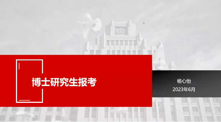 杨心怡结合自身考博经验,介绍了考博报名流程与备考建议。她从报名时间、材料提交、材料评议及专业考核四个方面介绍报名流程,建议大家在重要时间节点多关注备考学校官网信息,避免错过重要通知。在备考建议中,杨心怡围绕“早”字展开,建议有考博意愿的同学早考量、早准备和早复习。她强调把握时间、尽早准备,希望大家能够少走弯路,提高效率;针对考博初试与复试的参考书目、真题进行讲解,建议大家重视时政热点的积累,结合自身理解与前沿热点进行答题。