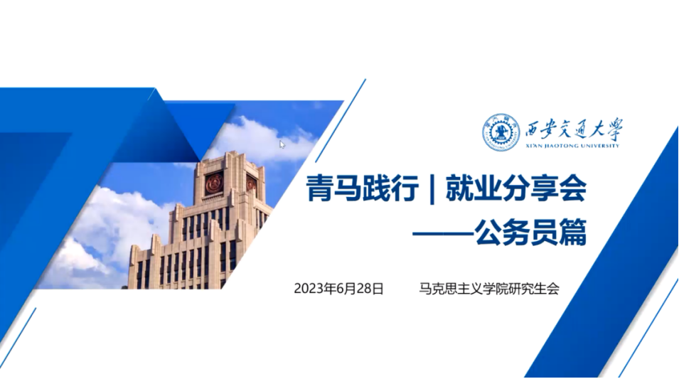 第三十三期青马践行就业经验分享会——公务员篇成功举办。本次分享会邀请学院2020级硕士研究生孙文凯、杜佳欣分享考公经验,为有志于考取公务员的同学们答疑解惑。学院研究生会实践与权益服务部刘辉主持本次会议。